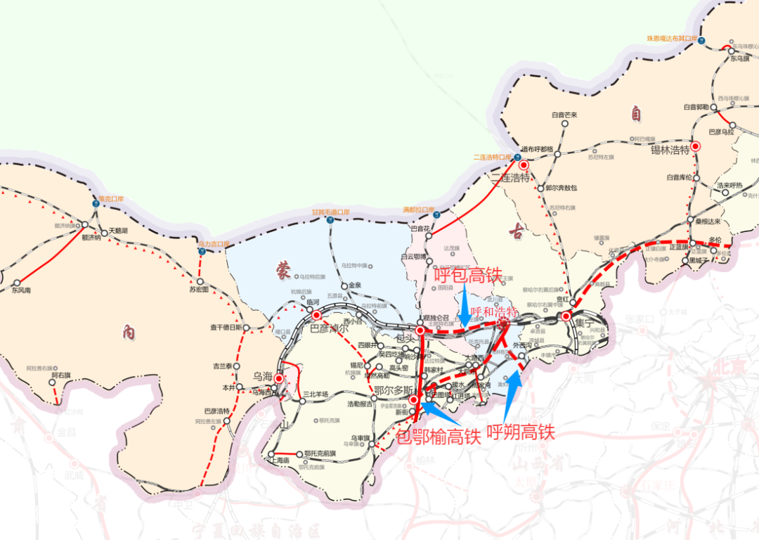 解读:内蒙古自治区这些推进项目中,包鄂榆高铁为“十四五”建设项目,齐海满高铁为“十四五”研究项目,其他项目仅纳入了自治区“十四五”铁路规划,暂未纳入国家规划。包鄂榆高铁是国家《中长期铁路网规划》中“八纵八横”包(银)海高铁主通道的最北段,也将是内蒙古首条时速350公里的高速铁路。项目全长277公里(内蒙古段180公里),总投资约405亿元(内蒙古段约281亿元)。目前项目包鄂段预可研、鄂榆段可研已完成。2025年自治区政府工作报告中提出年内开工建设包鄂榆高铁。但由于路地出资比例、资本金比例及建设运营主体组建等事宜未确定,项目进展未达预期。
