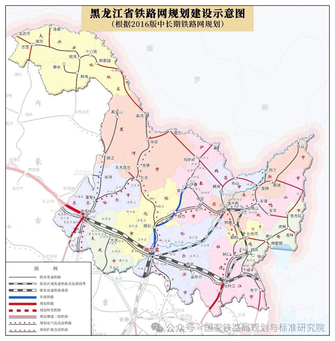 内蒙古“十四五”铁路规划图(局部)黑龙江省:完善现代化综合交通运输体系,建成运营哈绥铁伊、牡敦高铁和佳同、富加铁路扩能改造等项目,推进佳木斯至鹤岗至伊春高铁、哈尔滨至绥化至北安(龙镇)铁路电气化改造等项目工作,形成以哈尔滨为中心、联通十个市的两个半小时高铁交通圈。加快推动黑河至嘉荫至乌伊岭、韩家园至呼玛至黑河等沿边铁路规划建设。解读:黑龙江省推进的铁路项目中目前只有沿边铁路纳入了2016年版国家中长期规划。其中建设佳木斯至鹤岗至伊春高铁,对完善黑龙江省铁路网,形成黑龙江东中部铁路环线具有重要意义。项目方案研究已经完成,拟按照250公里/小时标准建设,全长约194公里。黑龙江沿边铁路建设有助于黑龙江实现东北全面振兴,加强中俄边境地区国防交通保障能力,对落实“一带一路”倡议和黑龙江“东部陆海丝绸之路经济带”战略规划具有积极意义。目前《黑龙江省沿边铁路规划》编制已全面启动。