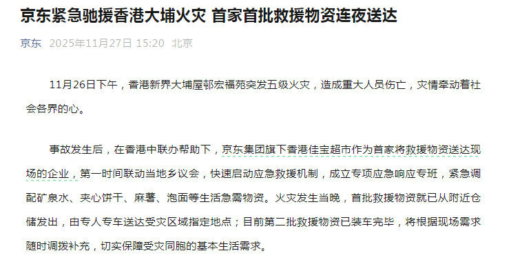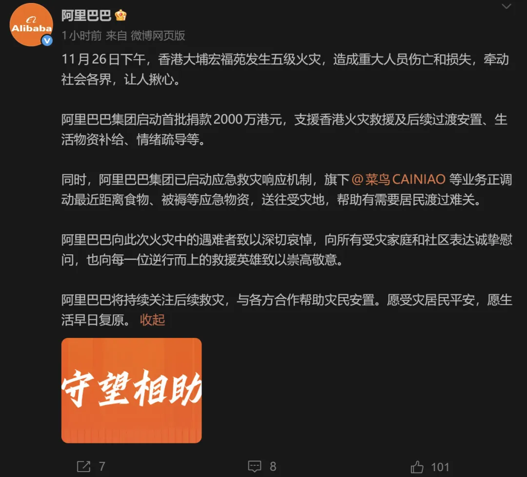 阿里巴巴集团启动首批捐款2000万港元,支援香港火灾救援及后续过渡安置、生活物资补给、情绪疏导等。 同时,阿里巴巴集团已启动应急救灾响应机制,旗下菜鸟等业务正调动最近距离食物、被褥等应急物资,送往受灾地,帮助有需要居民渡过难关。