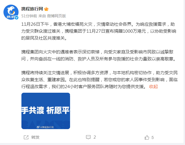 为响应救援需求,助力受灾群众渡过难关,携程集团于11月27日宣布捐赠1000万港元,以协助受影响的居民及社区共渡难关。