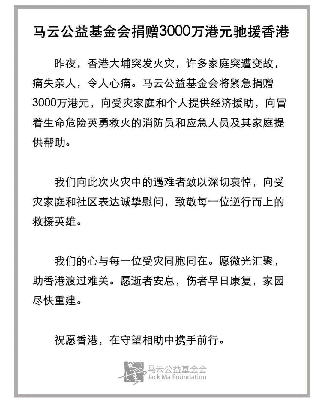 马云公益基金会将捐赠3000万港元,向受灾家庭和个人提供经济援助,向冒着生命危险英勇救火的消防员和应急人员及其家庭提供帮助。