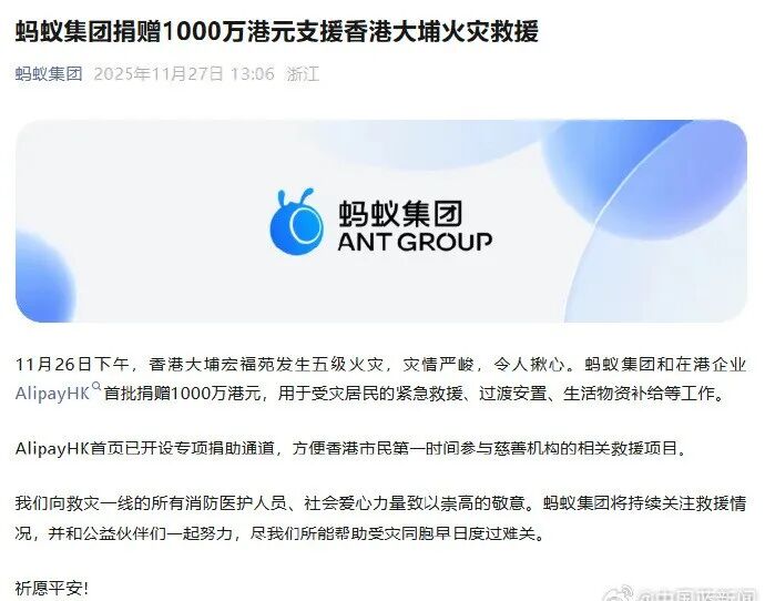 蚂蚁集团和在港企业AlipayHK首批捐赠1000万港元,用于受灾居民的紧急救援、过渡安置、生活物资补给等工作。