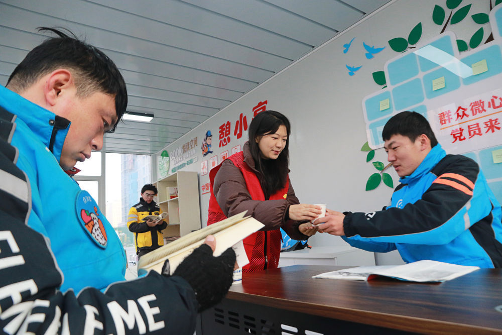 2023年12月27日,志愿者在山东省高密市密水街道“憩小亭”服务站为外卖骑手送上热水。入冬以来,山东省高密市密水街道推进“憩小亭”暖心服务站建设,为外卖骑手、快递小哥、网约车司机、环卫工人等户外劳动者提供饮水、无线上网、食物加热等多项服务,让他们感受到冬日里的温暖。