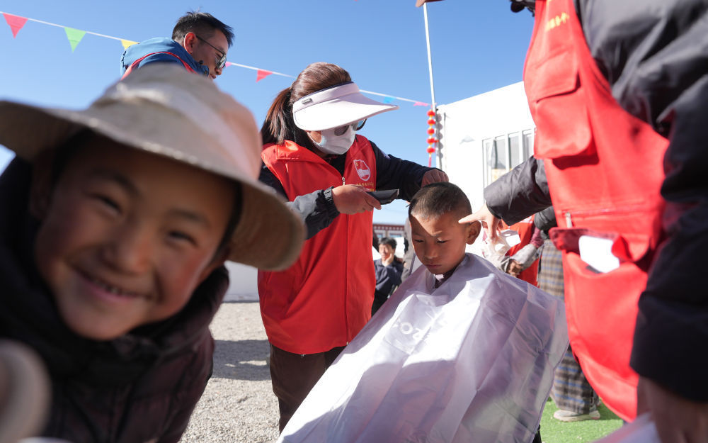 2025年1月26日,志愿者在西藏拉孜县吉如村安置点为孩子们理发。西藏定日县6.8级地震发生后,志愿者们迅速参与救援搜救、协助搭建帐篷、搬运赈济物资、协调村民所需。数百名大学生组成志愿者服务队,白天为安置点的孩子们辅导作业、陪孩子们运动;晚上组成巡逻队,守护安置点的安宁。