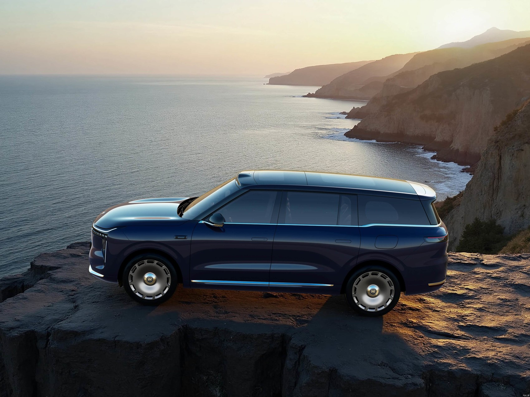 智己LS9延续了品牌感性、简约的设计语言,整体造型优雅大气。前脸采用封闭式格栅设计,搭配超感星轨贯穿式灯带,极具辨识度。车身侧面呈现出游艇巡航姿态,环绕车身的精致镀铬腰线流畅自然。标配20英寸轮毂,营造出行政级车型的沉稳气场,此外还提供21英寸和22英寸轮毂可选。车尾的Skyline贯穿式尾灯与车头相呼应,下方镀铬装饰简约精致。车身尺寸方面,智己LS9的长宽高分别为5279mm、2000mm、1806mm,轴距达到3160mm,属于标准的大型SUV规格,为车内空间奠定了良好基础。