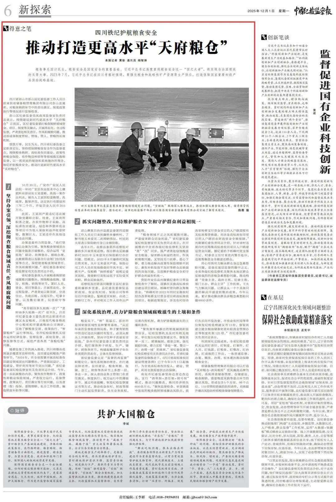 2025年12月1日,《中国纪检监察报》新探索版刊发《四川铁纪护航粮食安全 推动打造更高水平“天府粮仓”》。