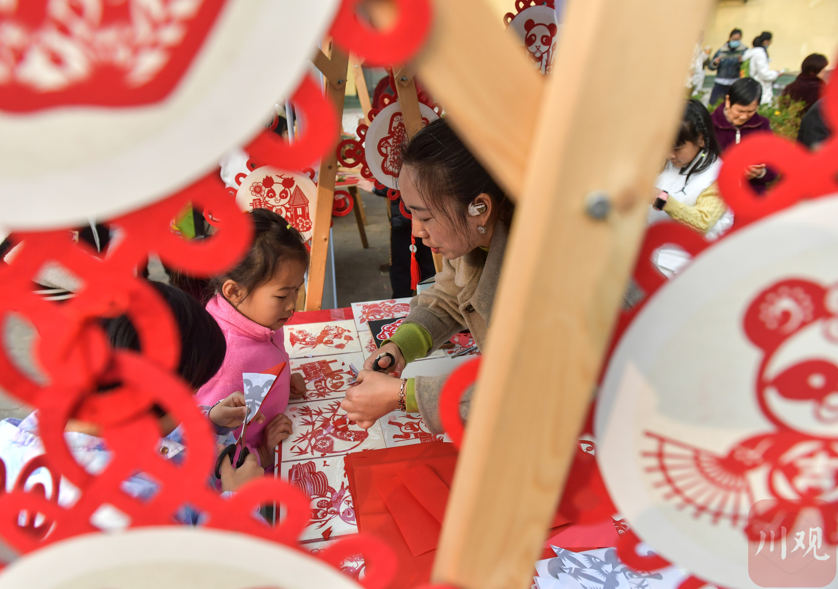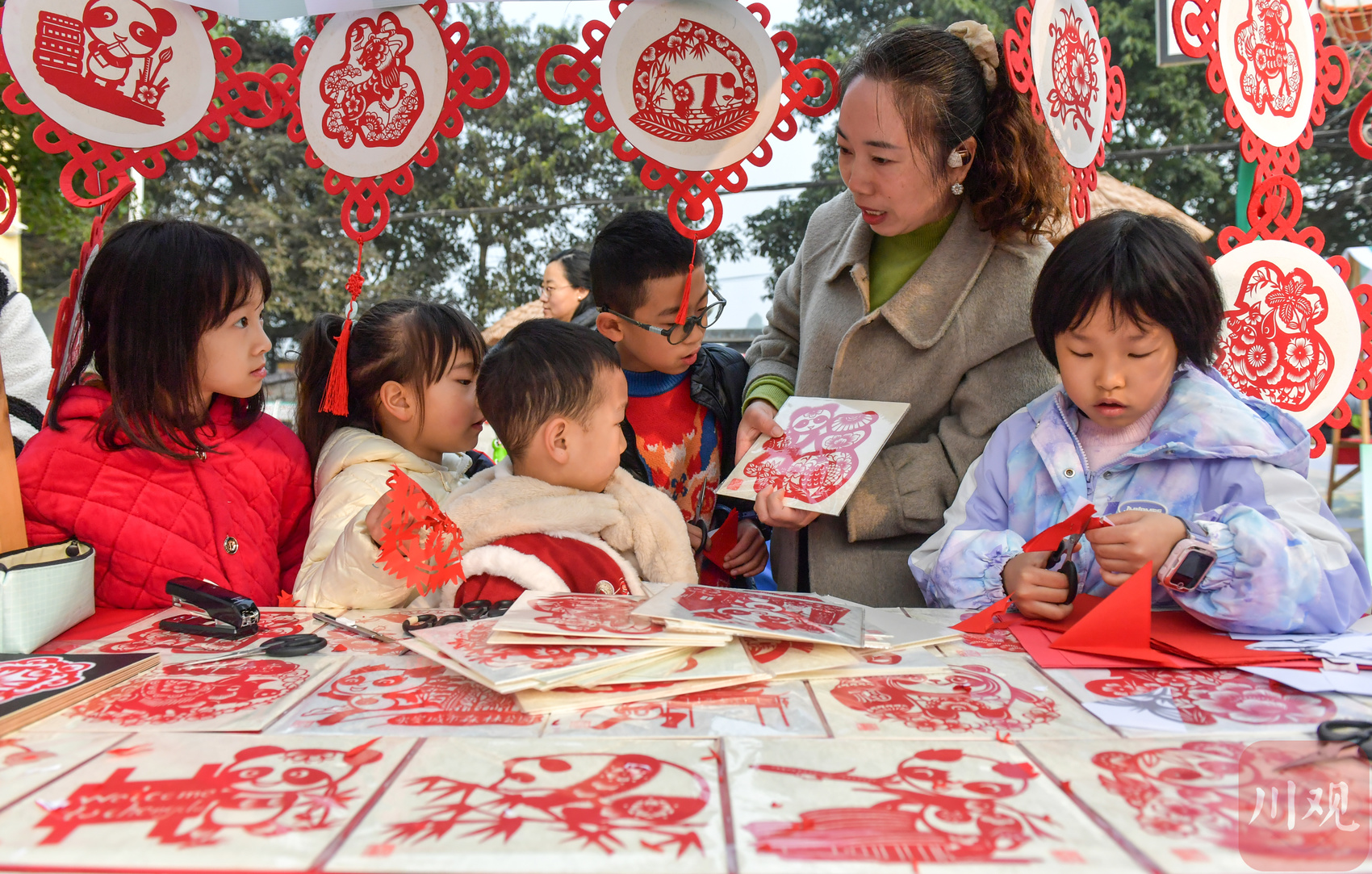 2025年11月30日,在成都市双流区永安镇梨园村,小朋友在老师的指导下学习剪纸。