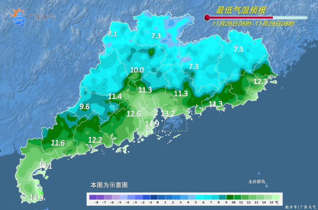 11月29日,粤西到珠江口西侧市县晴转多云,其余市县晴间多云。最低气温:粤北和珠江三角洲北部市县3~9℃,局部有霜冻,南部沿海市县12~14℃,其余市县9~12℃。