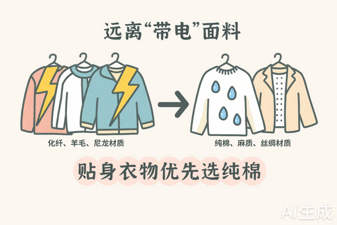 化纤、羊毛、尼龙这些材质特别容易产生静电,可以换成纯棉、麻质、丝绸的衣服,贴身衣物优先选纯棉,减少皮肤与衣物的静电摩擦。