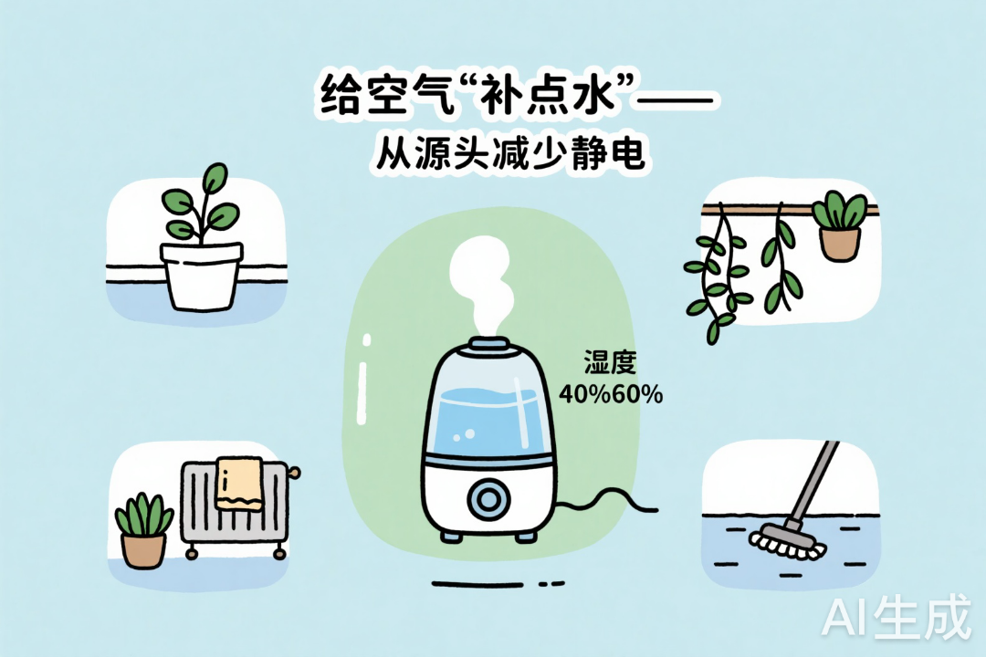 静电最爱干燥的环境。放一台加湿器,把湿度维持在40%~60%之间,电荷就不容易积累。如果没有加湿器,也可以用这些小妙招: