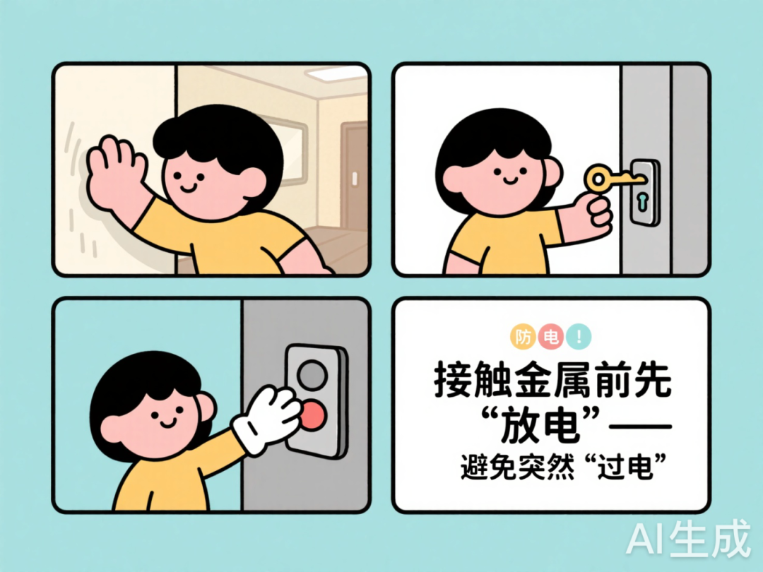 摸门把手等金属物体前,先用手摸一下墙面、地面,把身上的静电导走;也可以用钥匙尖轻碰金属物体,让静电通过钥匙释放。戴一副棉手套再接触金属,能隔绝静电直接放电。