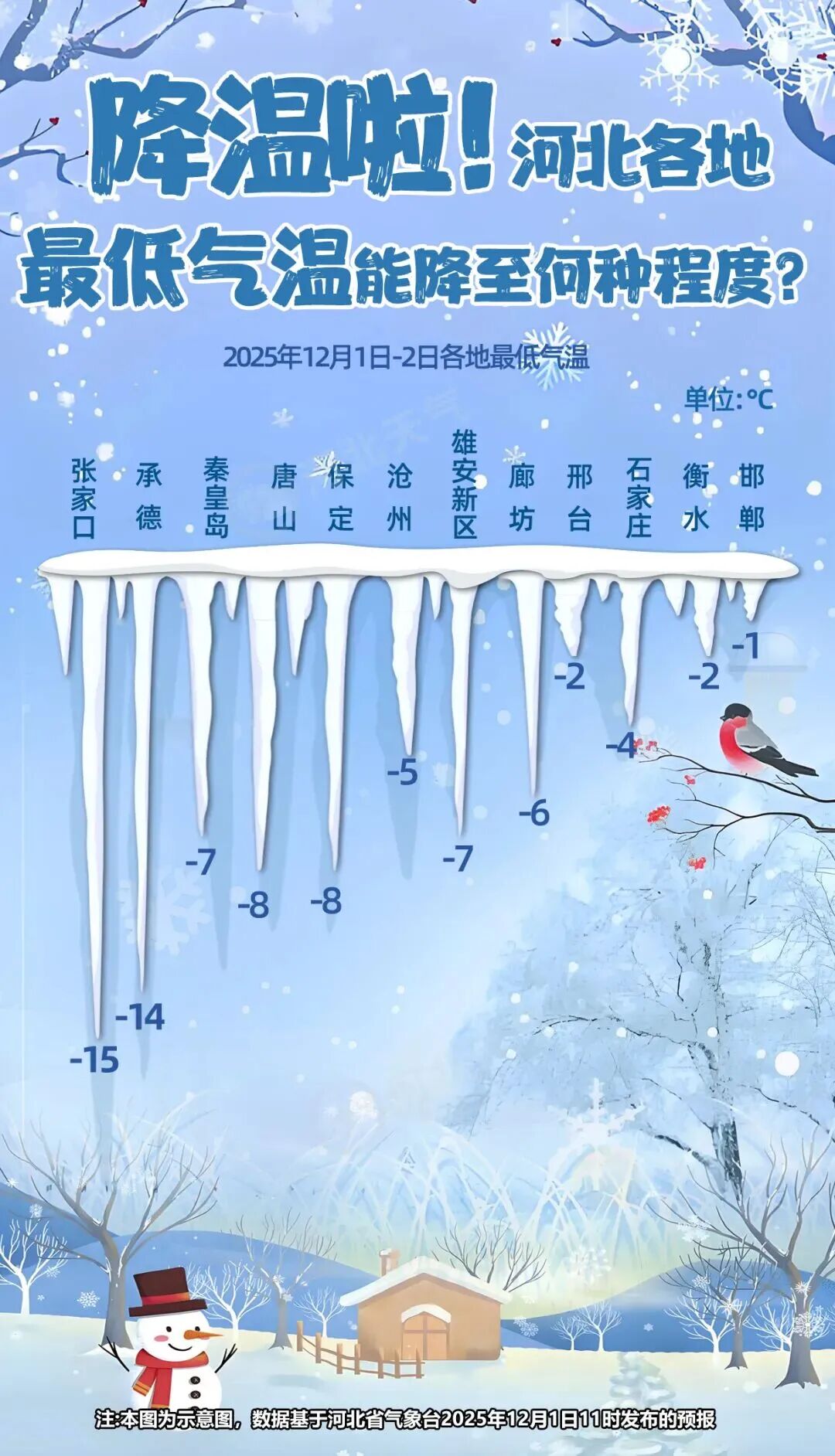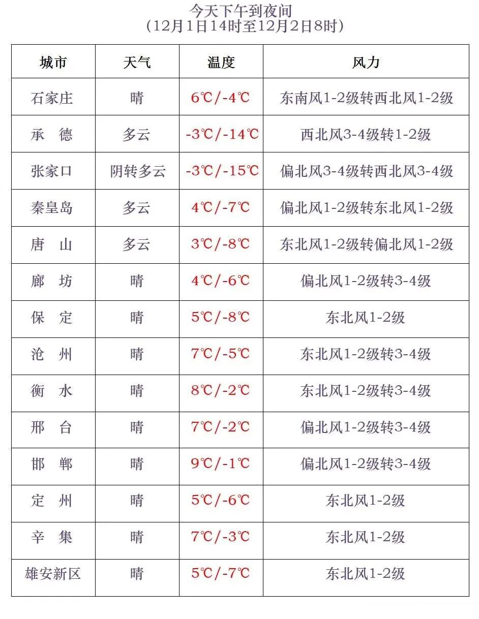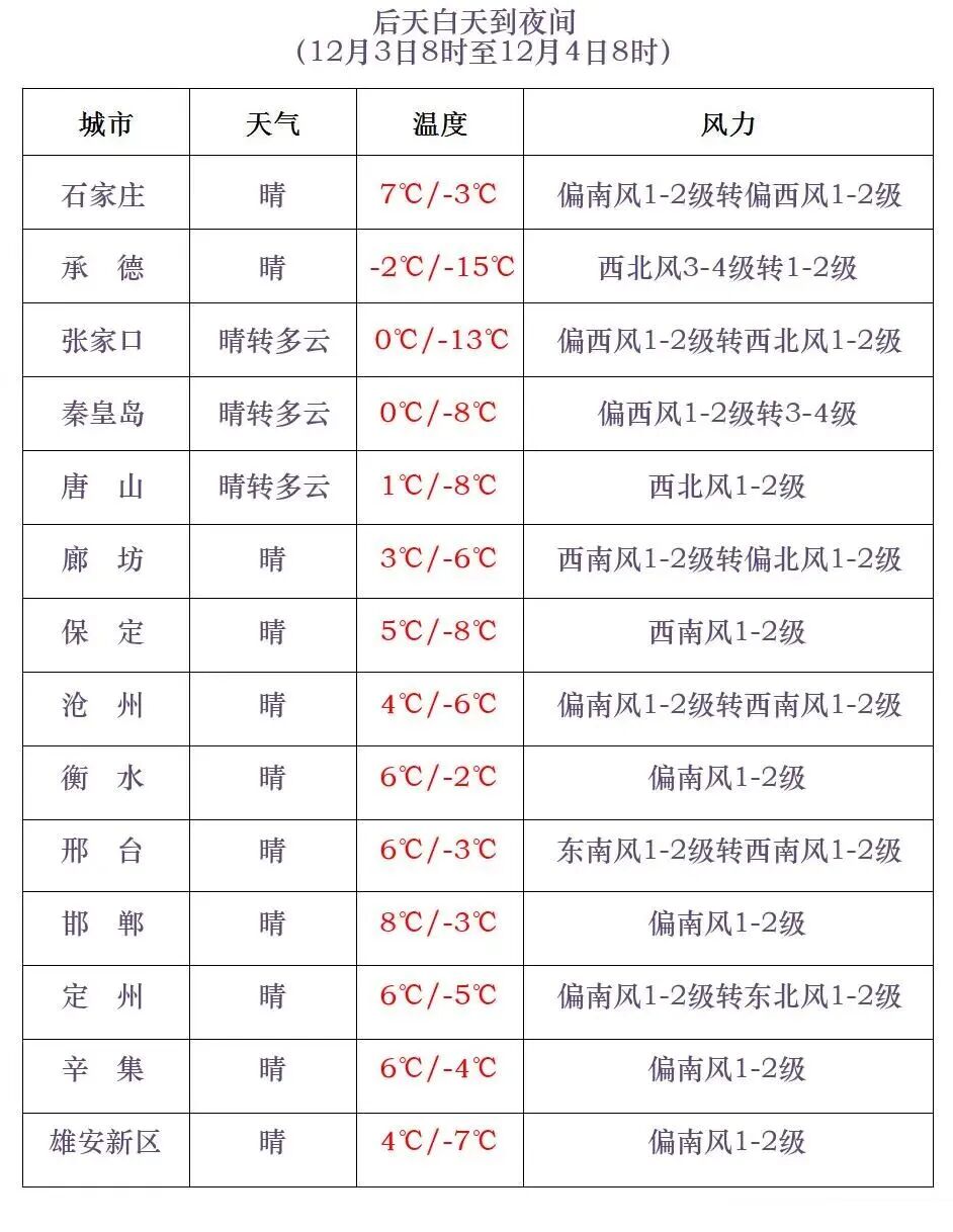 受冷空气影响,2日早晨,张家口、承德最低气温继续下降6~10℃,其他地区下降2~5℃。最低气温张家口北部、承德北部降至-30~-19℃,保定、廊坊以南地区降至-9~-1℃,其他地区降至-18~-10℃。请注意防范。