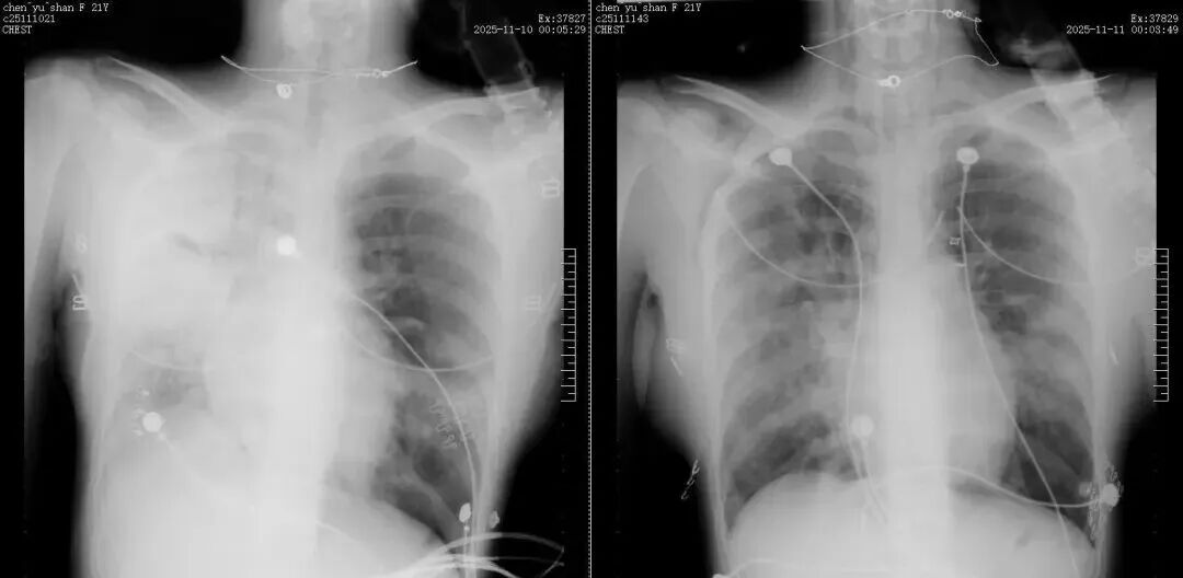 11月11日清晨,赵考昌教授和汤贵良医生查房时,发现小陈在联合呼吸支持下指脉氧饱和度已回升至98%。在评估其身体状态可耐受检查后,团队立即安排床旁支气管镜肺泡灌洗液病原菌检测,精准检出金黄色葡萄球菌、星座链球菌及甲型流感病毒H3N2。明确病因后,医护团队第一时间优化抗生素方案,开展靶向抗感染治疗。当日复查胸片显示,小陈右肺感染较前明显好转,病情迎来重要转机。