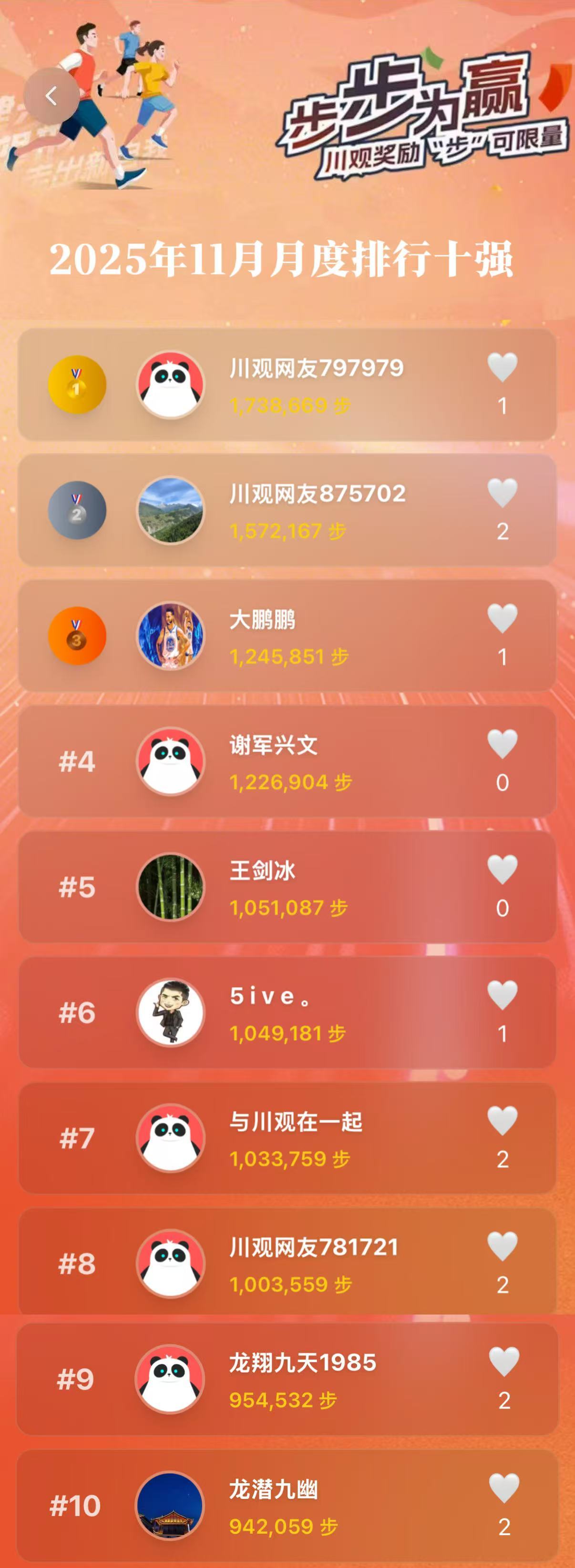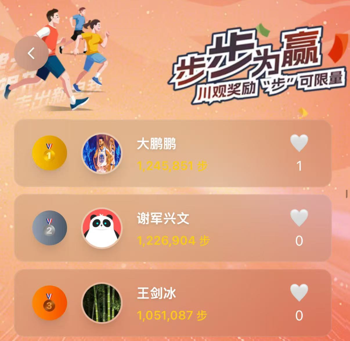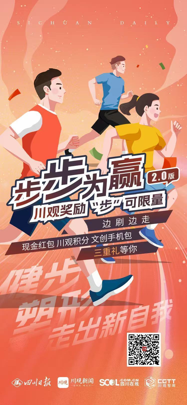 加入“步步为赢”就有奖励!即使你未能中奖或是进入月度前100排名,但是你走的每一步都算数,我们都会以川观新闻积分的形式给予奖励哟,1000步=30积分,记得在活动页面兑换。这可是超有用的积分,能换实物礼品、抽大奖、做公益,参与川观新闻中不定期上新各类积分隐藏福利。喜欢答题的“川观步友”们,还可以用来在答题活动中兑换答题次数,记得关注起来!