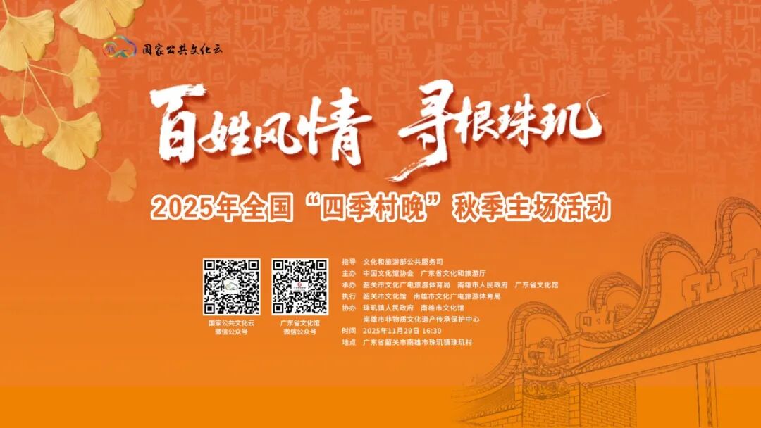 本期“村晚”直播活动将于11月29日16:30,在广东省韶关市南雄市珠玑镇珠玑村准时开启,活动名称为2025年全国“四季村晚”秋季主场活动。此次活动由文化和旅游部公共服务司指导,中国文化馆协会、广东省文化和旅游厅主办,韶关市文化广电旅游体育局、南雄市人民政府、广东省文化馆承办,韶关市文化馆、南雄市文化广电旅游体育局执行,珠玑镇人民政府、南雄市文化馆、南雄市非物质文化遗产传承保护中心协办。