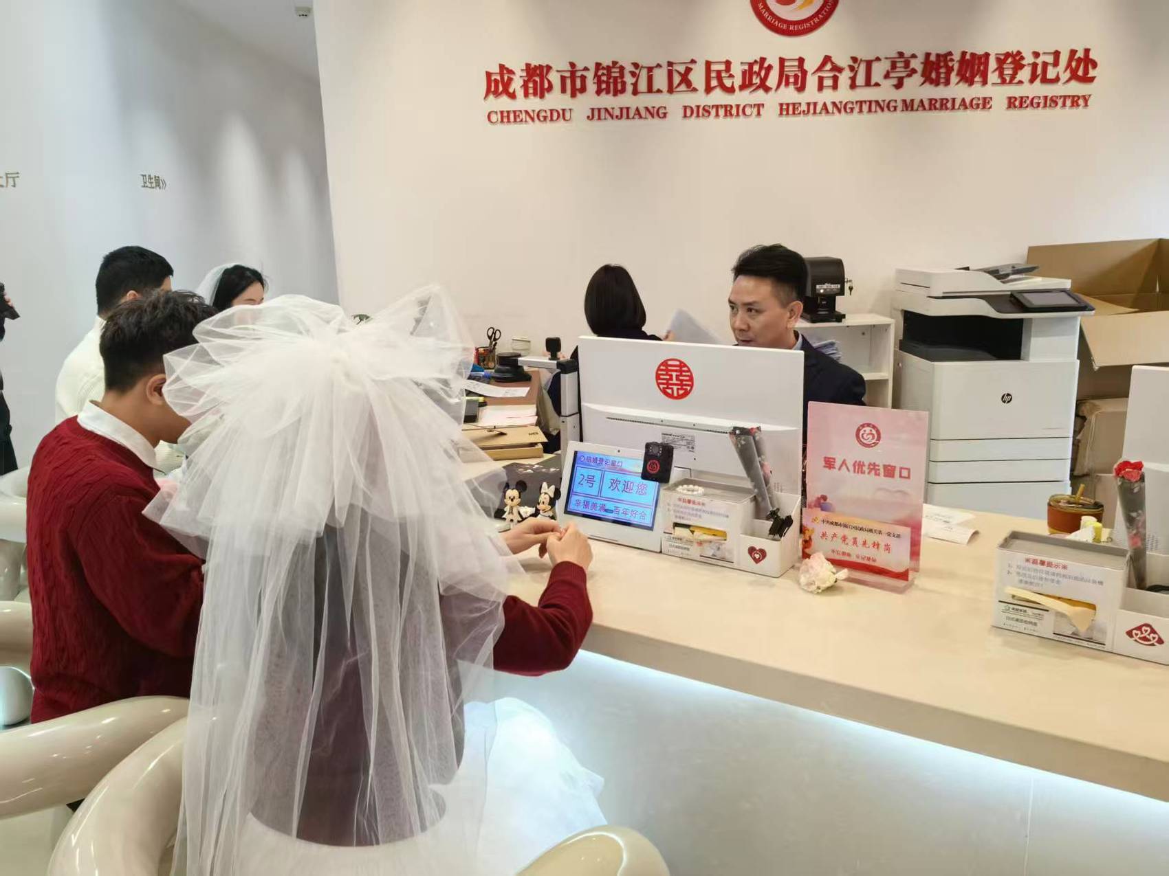 王先生今年步入而立之年,也做出了人生中的重要决定——与刘女士携手步入婚姻。就在上个月,他们刚刚举办了婚礼。“我们关注这项政策很久了,上周看到新规正式出台,就决定赶紧来领证。”王先生笑着说道。身旁的刘女士比他小两岁,说着:“他前两天还在外地出差,今天一回成都就特意请了半天假赶过来。”