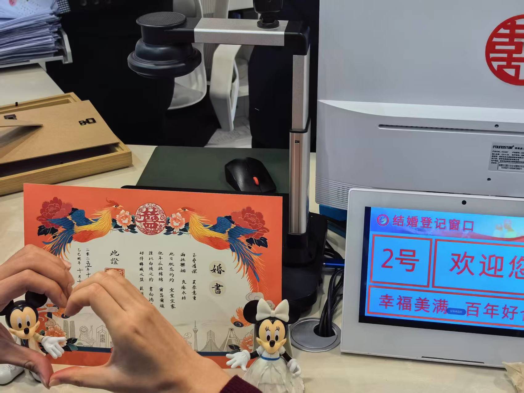 “两位再靠近一点——笑一笑!”姚女士和丈夫特意请来摄影师,记录下这珍贵的一刻。画面里,两人手指比心,目光相汇,身后是婚姻登记处设置的颇具成都特色的婚书——红纸之上,凤凰于飞、芙蓉吐蕊、喜字窗花等传统纹样。