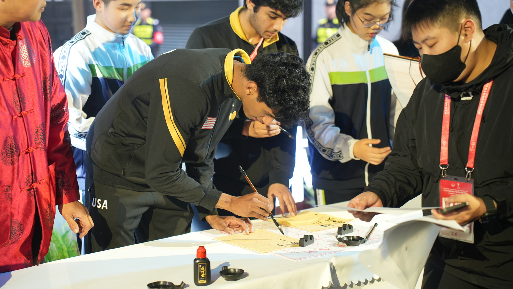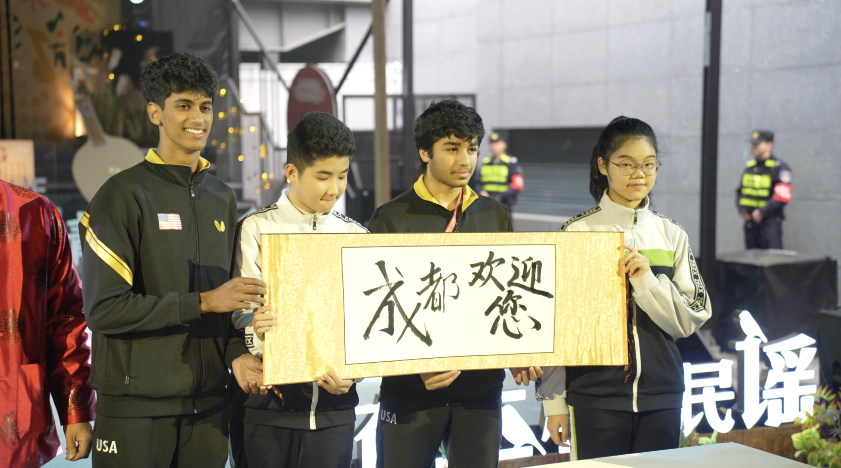 随后,在专业书法老师的指导下,美国乒乓球运动员与棕北中学学生一一结对。他们从握笔、运笔学起,共同完成“成都欢迎你”和“乒向未来”两幅作品。字迹略显生涩,友谊却在笔墨间悄然升温。
