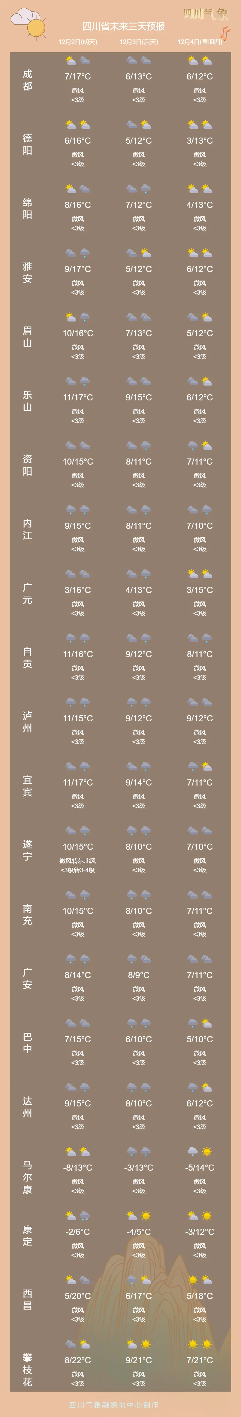四川省气象台预计,12月5日至7日,盆地以多云天气为主。之后,9日至10日,盆地还有一次弱降温降水天气过程。