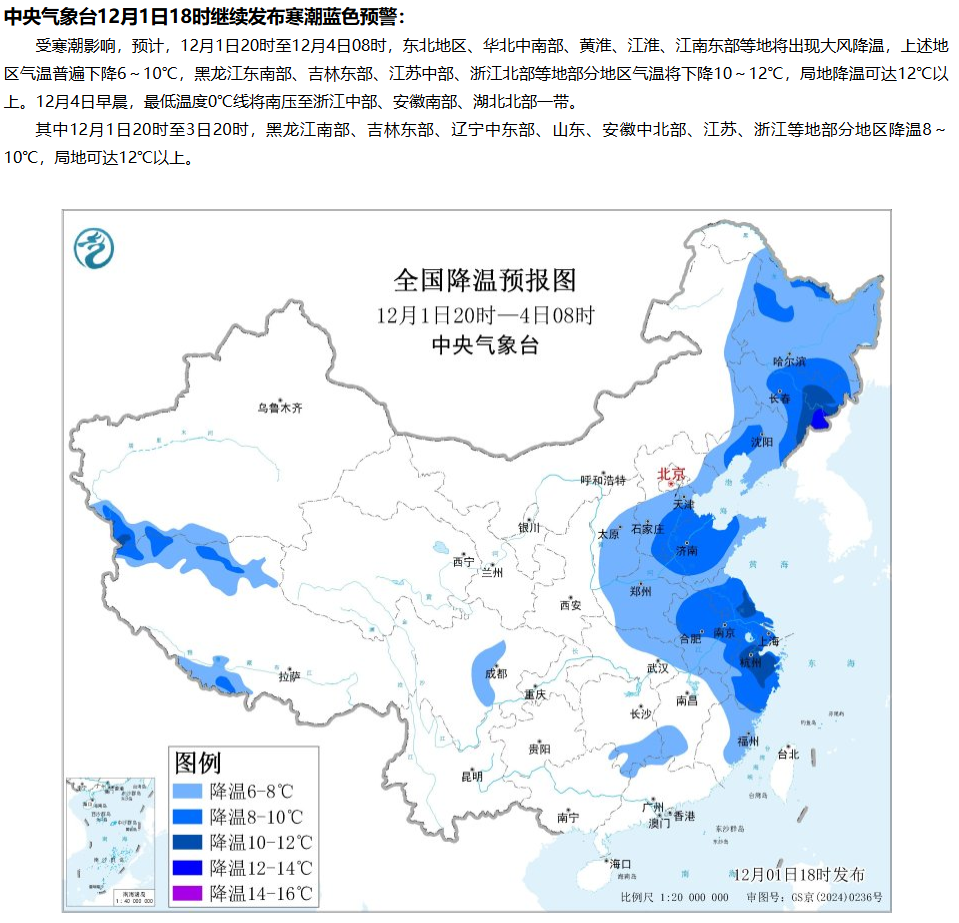 今天(12月1日),中央气象台继续发布寒潮蓝色预警: