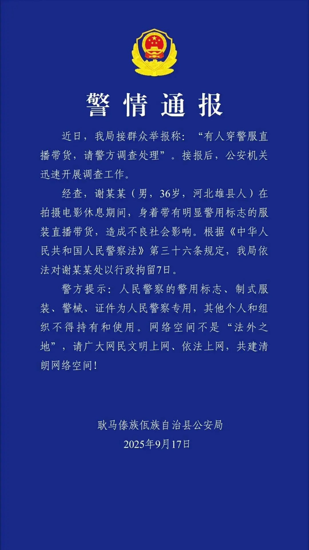 9月17日,云南警方发布警情通报,称“嘎子哥”演员谢某某(男,36岁,河北雄县人)在拍摄电影休息期间,身着带有明显警用标志的服装直播带货,造成不良社会影响,决定对其行政拘留7日。