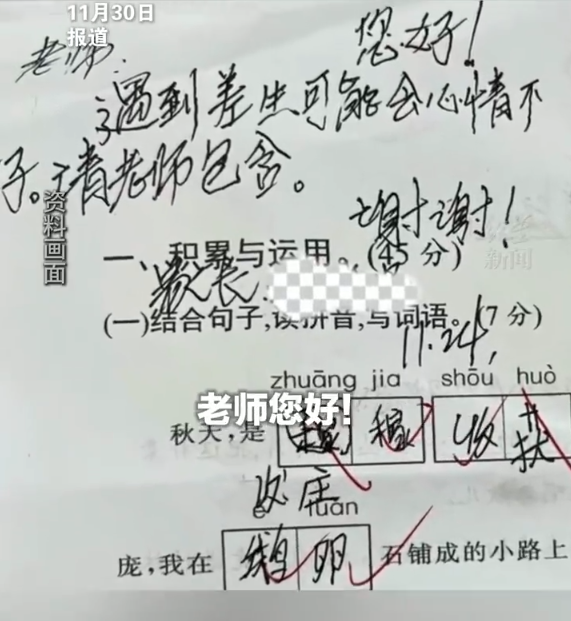 湖北襄阳一名四年级学生语文小测验拿了44分,孩子的爷爷却在试卷上写下真诚致歉:老师您好!遇到差生可能会心情不好,请老师包涵,谢谢!
