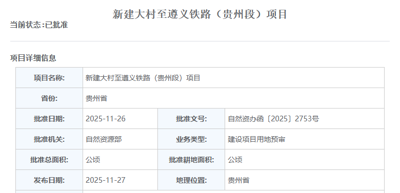 11月27日,自然资源部办公厅印发《关于新建大村至遵义铁路(贵州段)项目建设用地预审意见的函》,正式批复项目用地预审。用地预审是项目可研批复的重要前置要件之一,意味着项目离可研批复又推进了一大步。