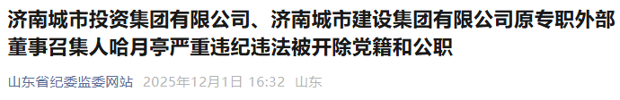 据济南市纪委监委消息:日前,经济南市委批准,济南市纪委监委对济南城市投资集团有限公司、济南城市建设集团有限公司原专职外部董事召集人哈月亭严重违纪违法问题进行了立案审查调查。