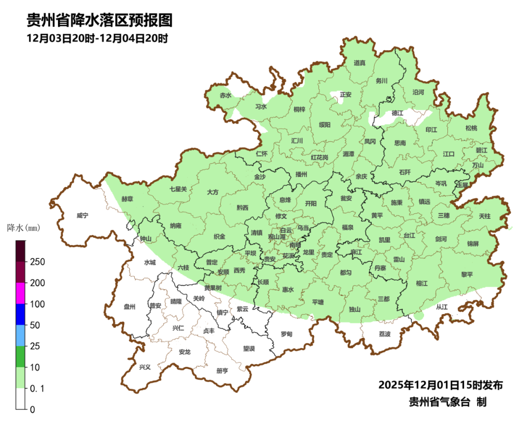 此次降温时间为12月2日至12月4日。最强降温时段出现在12月2日夜间至12月3日夜间,各地最低气温下降3~7℃。最低气温出现在3日夜间,其中毕节市大部、贵阳市、黔南州北部、黔东南州西北部、万山等地最低气温降至2~5℃,其余大部分地区最低气温降至5~9℃。降温范围自北向南气温将逐步下降。