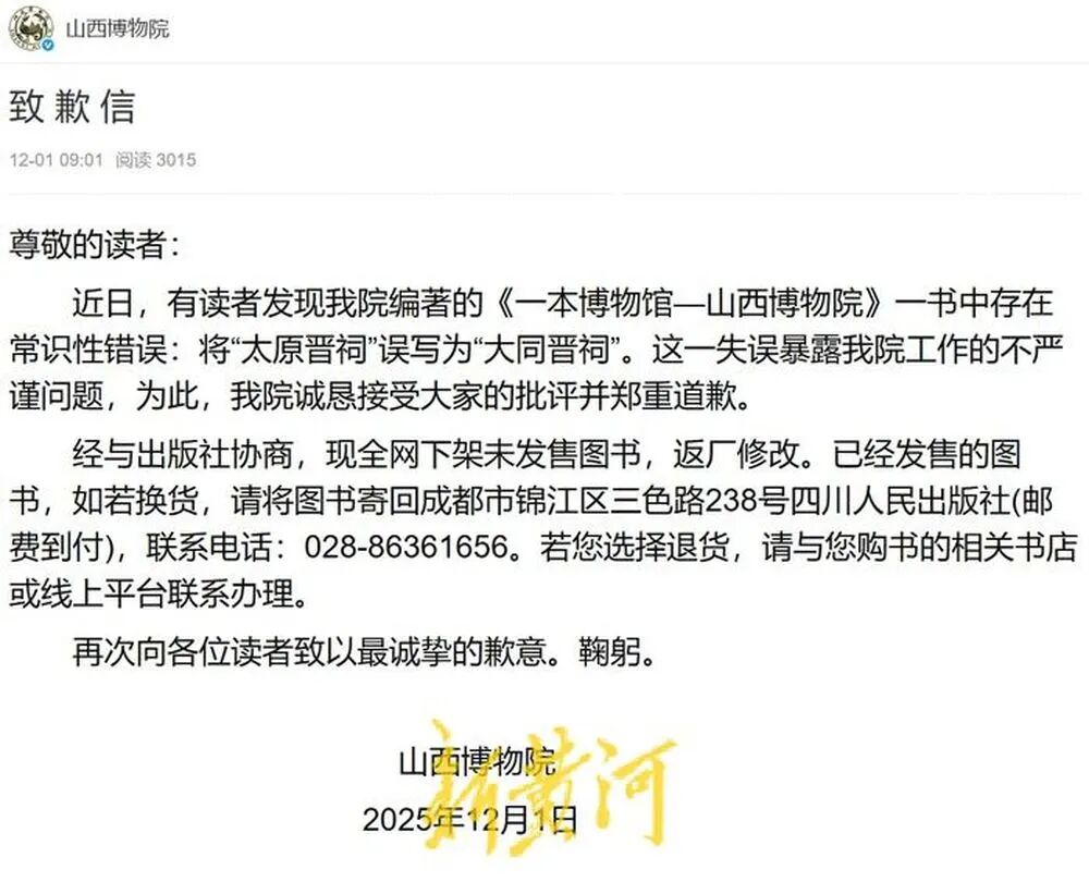 近日,有读者发现我院编著的《一本博物馆—山西博物院》一书中存在常识性错误:将“太原晋祠”误写为“大同晋祠”。这一失误暴露我院工作的不严谨问题,为此,我院诚恳接受大家的批评并郑重道歉。