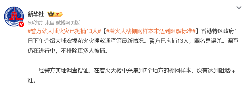 另据新华社消息,香港特区政府1日下午介绍大埔宏福苑火灾搜救调查等最新情况。警方已拘捕13人,罪名是误杀。调查仍在进行中,不排除更多人被捕。