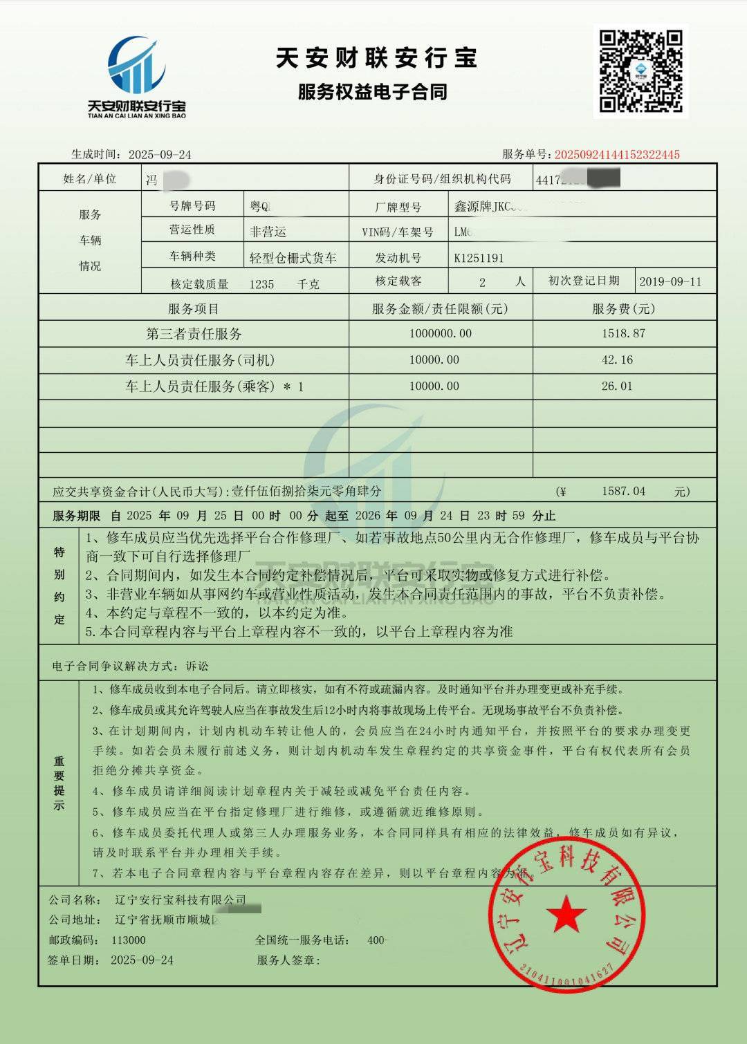 冯先生提供的电子合同显示,他交纳了1587元,服务项目包括第三者责任服务、车上人员责任服务(司机)、车上人员责任服务(乘客)。但合同的落款并非为保险公司,而是辽宁安行宝科技有限公司。