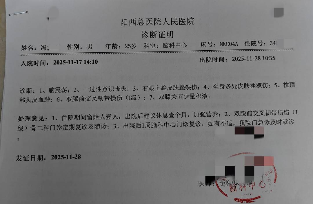 事故当日,冯先生被送往医院接受治疗,11月28日出院。医院的诊断证明显示,事故导致冯先生脑震荡、全身多处皮肤擦挫伤等。“我的货车报废了,治疗一共花费了9000多元,都是自己垫付的。住院期间联系了安行宝公司,才发觉买的是共享修车服务。而对方一直找借口拒绝理赔,11月26日起,和我对接的工作人员就没有回复任何消息了。”