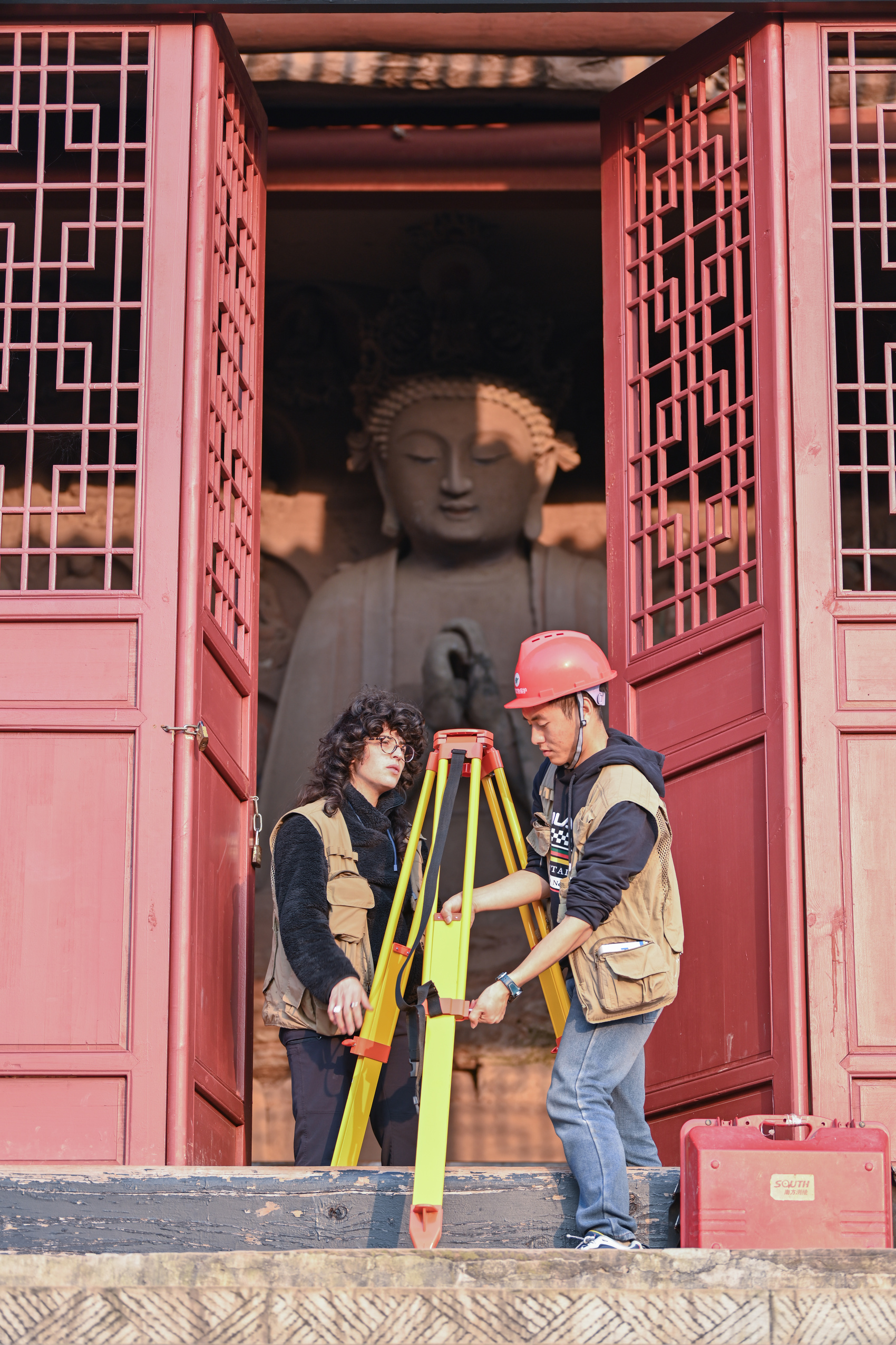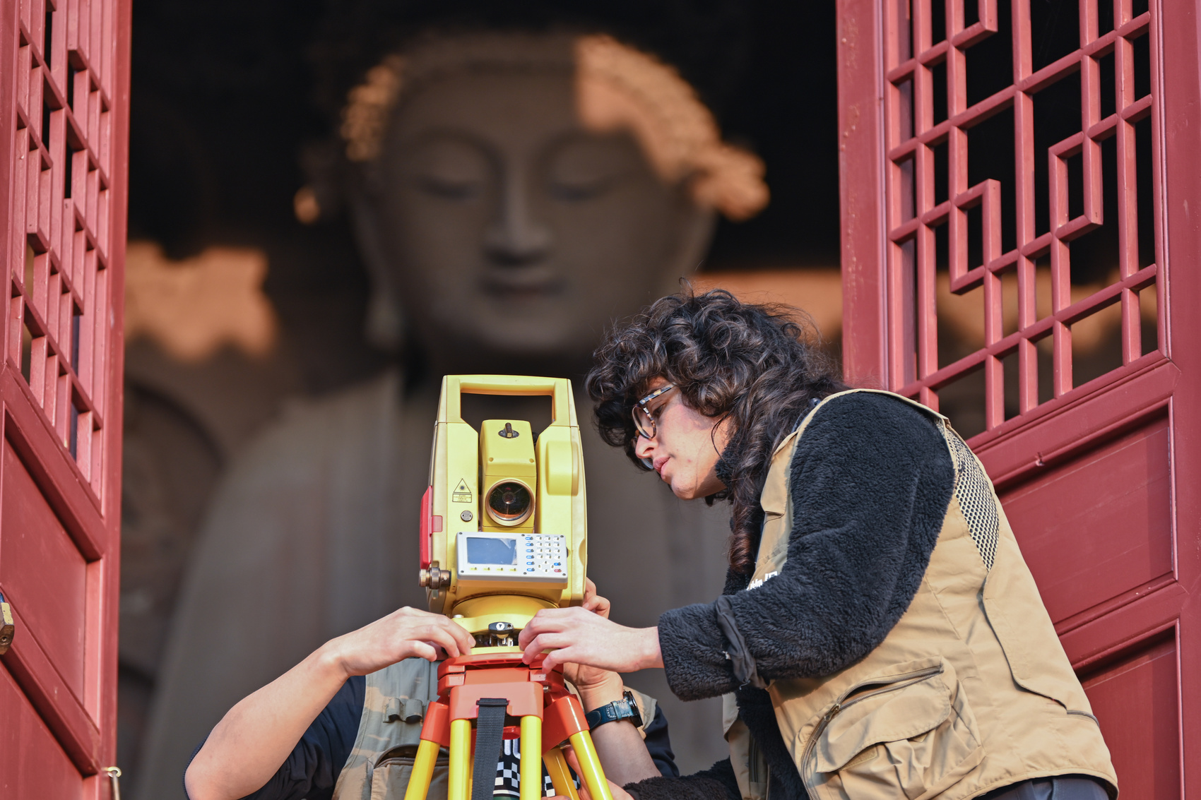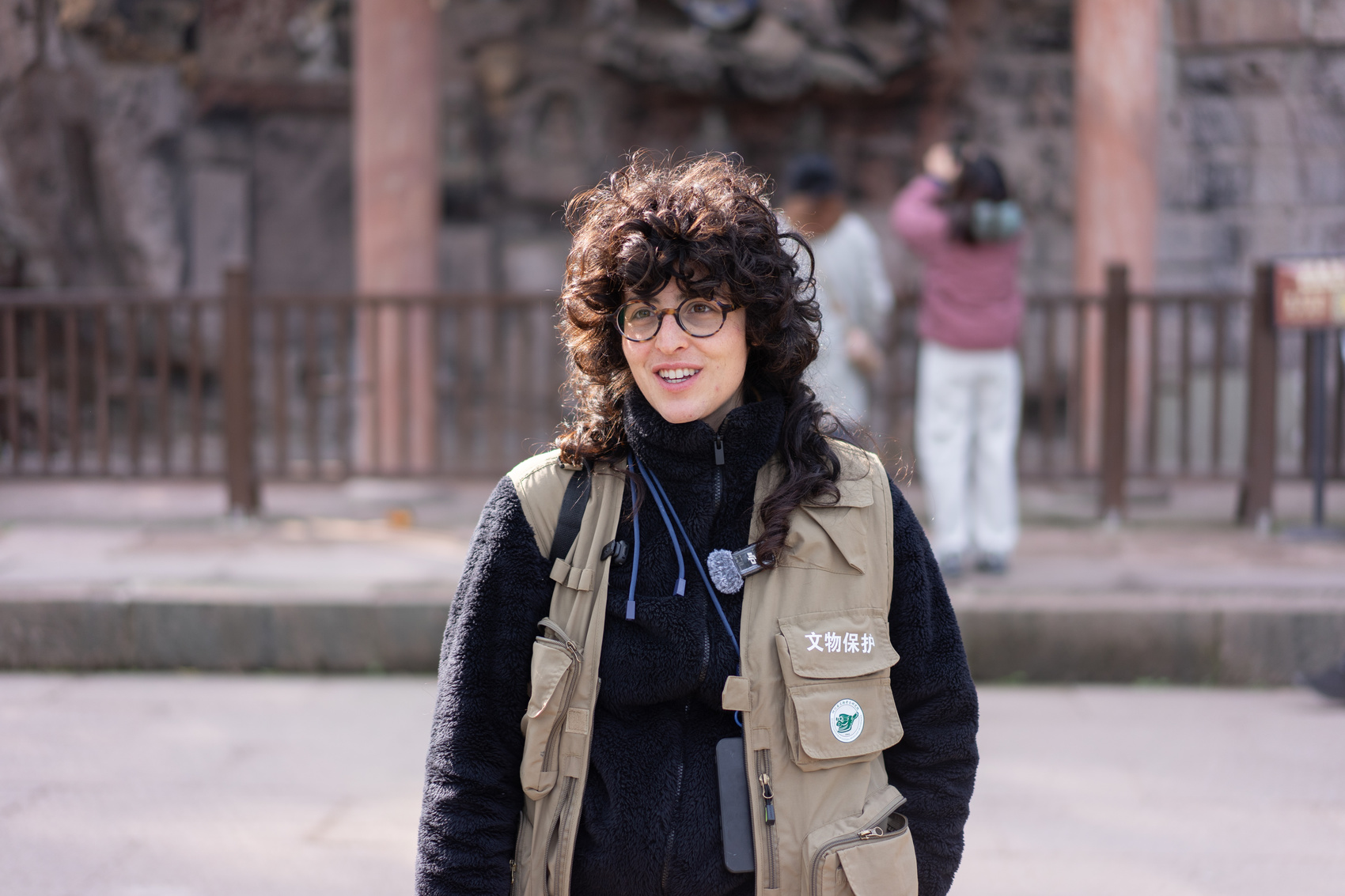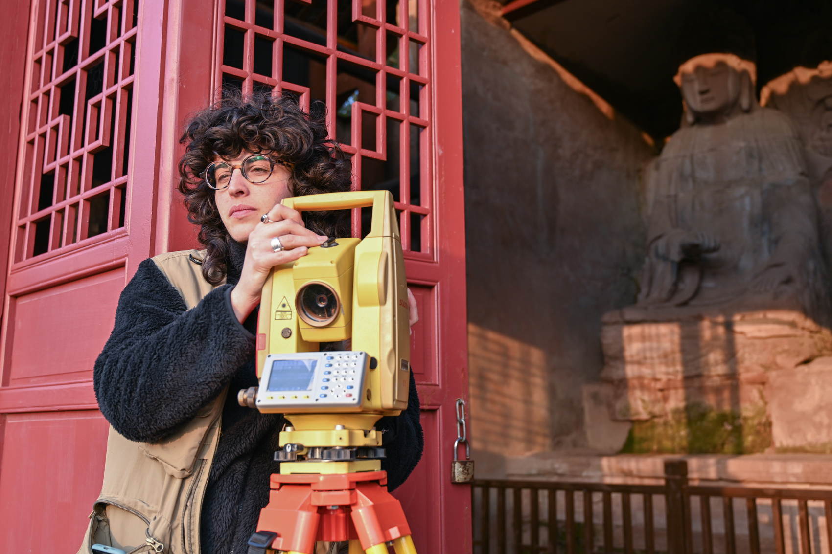 11月26日,娜塔莉在安岳塔坡的佛像旁采集数据。