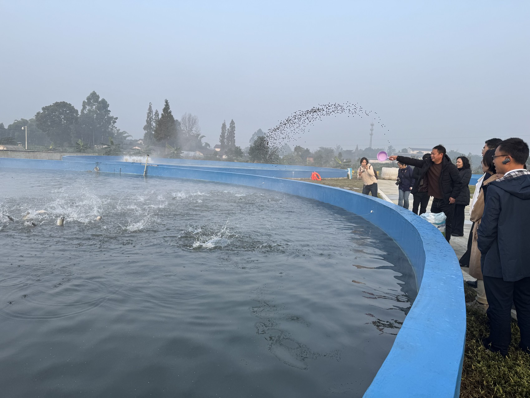 工作人员向鱼塘投喂饵料 。