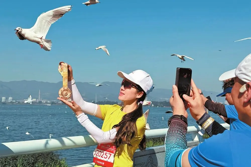 参赛选手完赛后在滇池畔与红嘴鸥合影留念 高吴双 摄