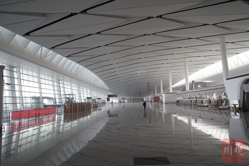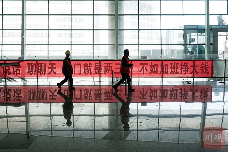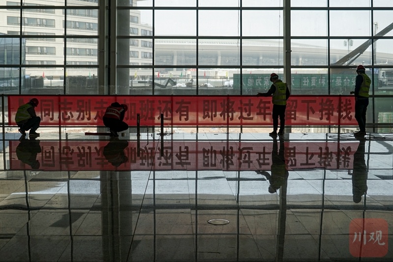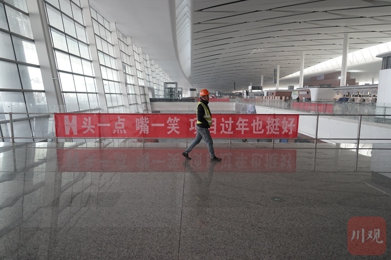 1月19日上午,成都天府国际机场T2航站楼的春节横幅一挂起来,瞬间把成都春节氛围组的人气带动起来——这个每天有4000多名工人奋战的工地,在这个冬日更添一把“火”。