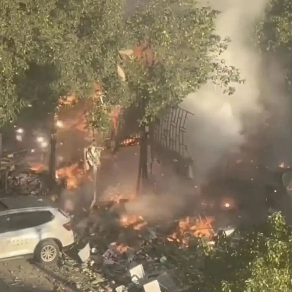 事发视频显示,伴随一声巨大的爆炸声响,现场火光冲天、出现浓烟滚滚。事发门店的墙体发生大坍塌,爆炸产生的冲击波将一辆停在路边的白色轿车掀翻并引燃。 有附近居民在社交媒体发声称,所在楼栋的窗户玻璃被震碎。