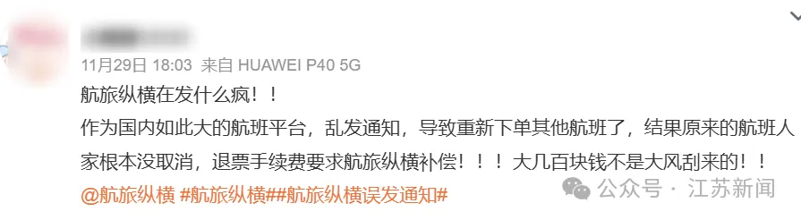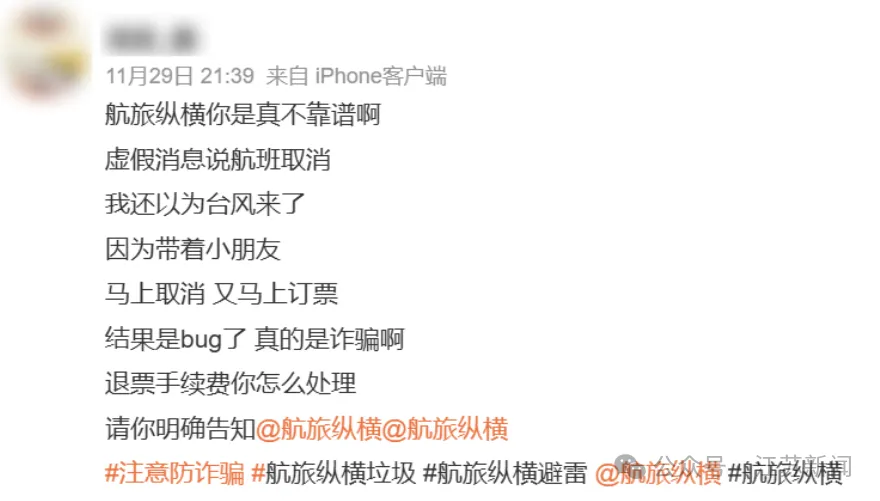 近日,多位网友反映,在11月29日下午15:00左右收到来自航旅纵横的航班取消提醒,部分用户在重新购票后才发现,实际航班并未取消,而是由于航旅纵横出现系统故障,推送了错误信息。不少用户因此额外承担了票价差价及退票手续费。