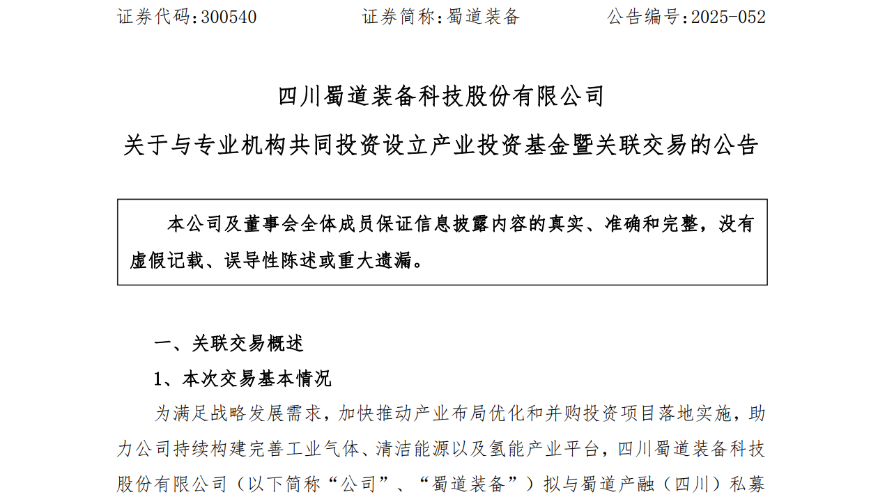 12月1日晚间,四川蜀道装备科技股份有限公司(证券简称“蜀道装备”)公告称,公司拟与蜀道产融(四川)私募基金管理有限公司(以下简称“蜀道产融管理公司”)、蜀道(四川)股权投资基金有限公司(以下简称“蜀道股权基金公司”)共同投资设立蜀道(四川)气体产业股权投资基金(有限合伙),主要围绕工业气体(含特种气体、电子气体)、LNG、氢能领域设立子基金或开展直接股权投资。