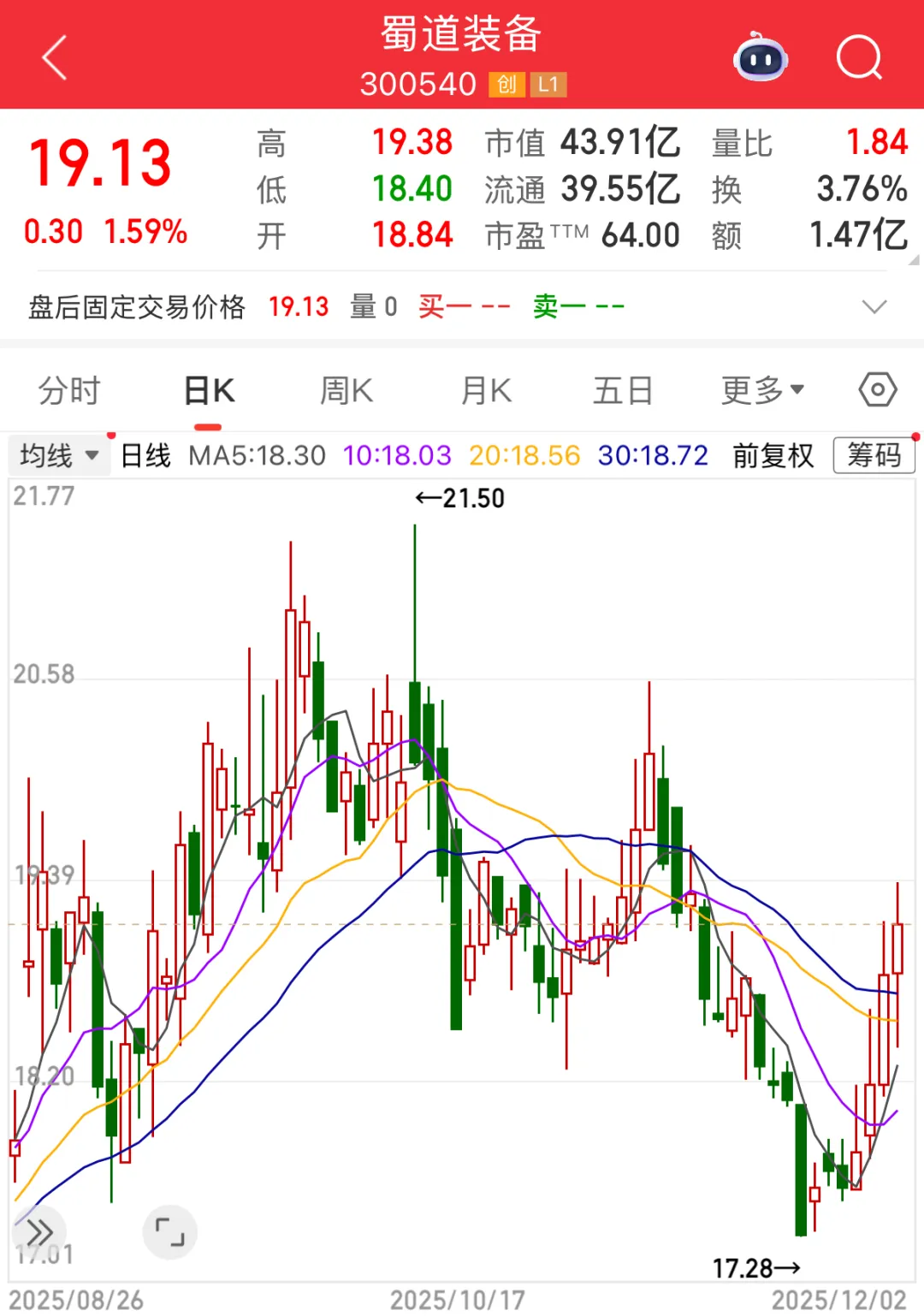 二级市场方面,截至12月2日收盘,蜀道装备报19.13元/股,总市值43.91亿元。
