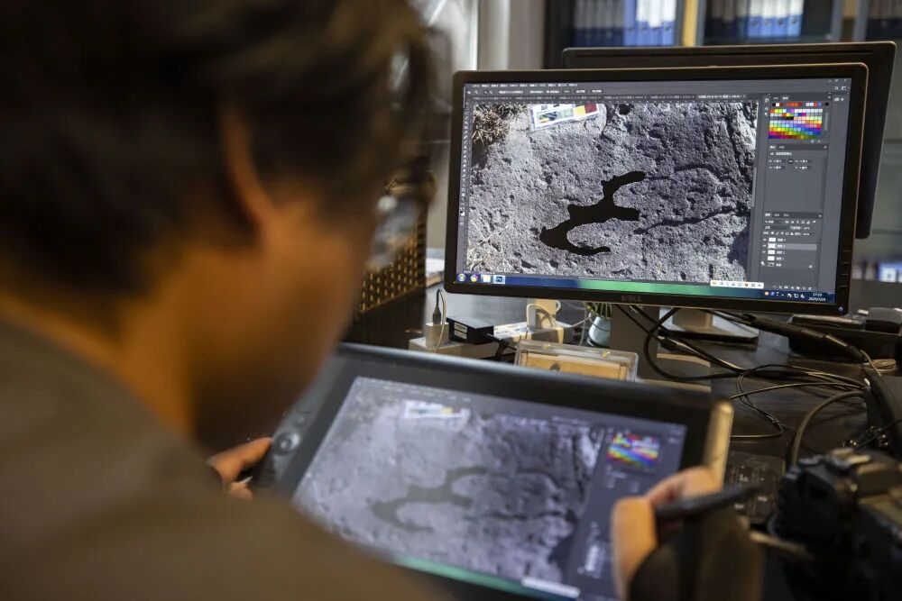 2025年7月23日,工作人员在绘制贺兰山岩画电子线描图。新华社记者 杨植森 摄