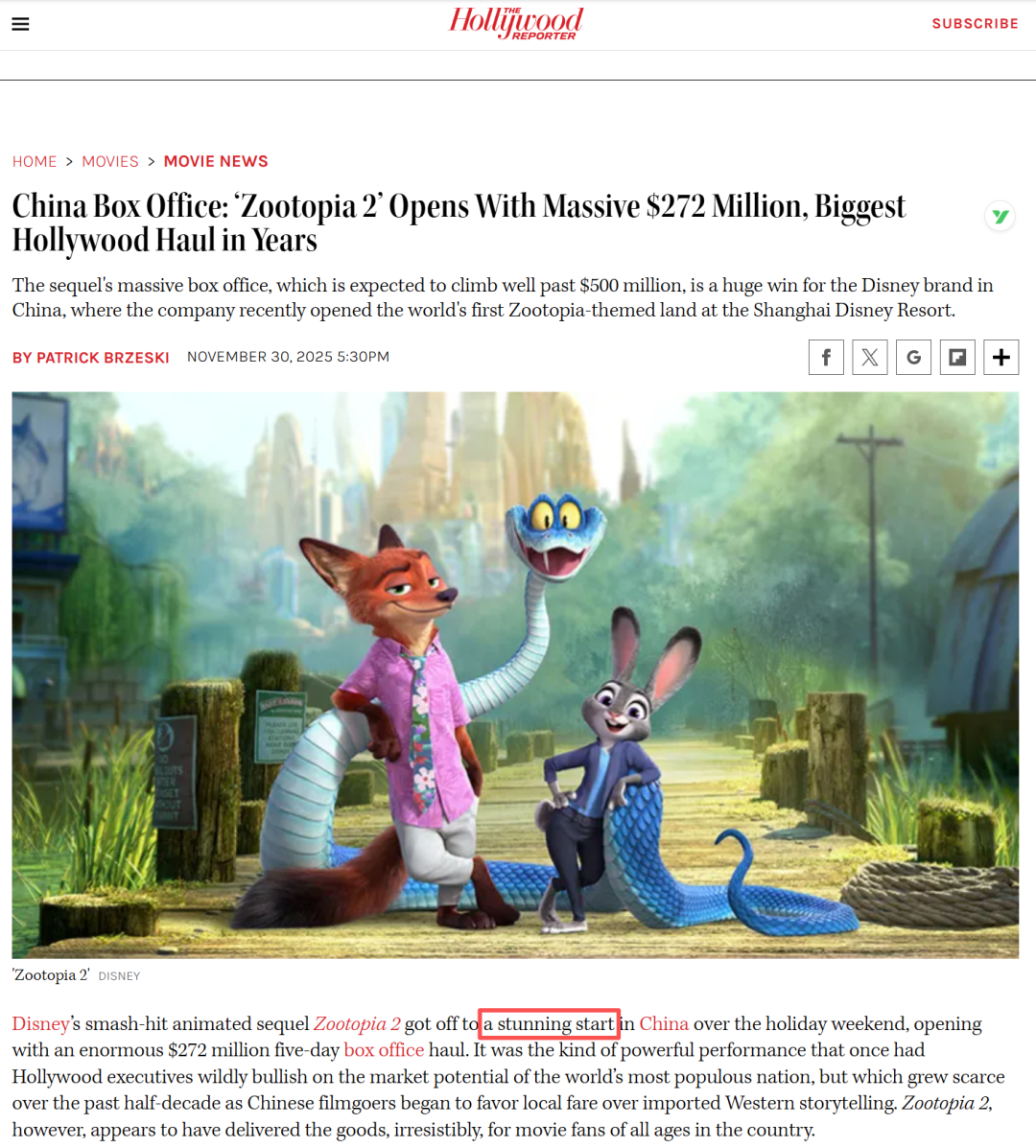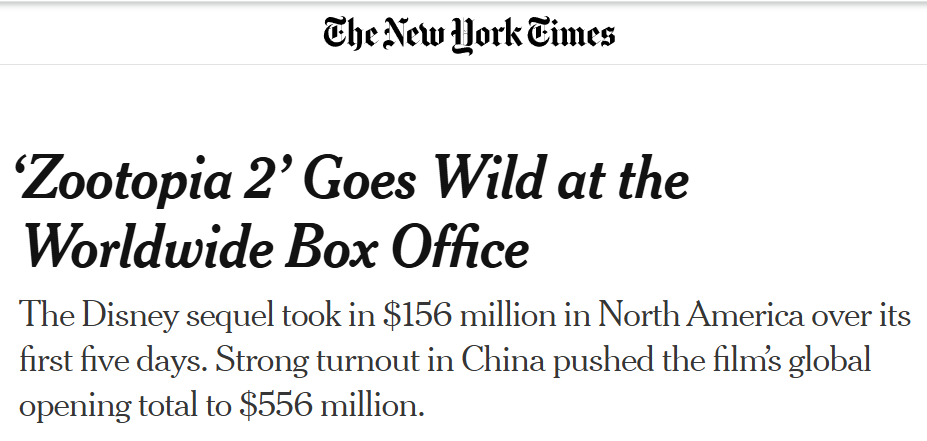 长期报道全球票房动态的南希·塔塔格里奥内表示,《疯狂动物城2》的亮眼表现虽然在预期之内,却远远超出了好莱坞今年对中国市场的保守判断。