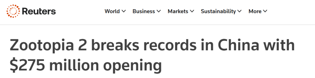 此外,另有多家外国主流媒体报道了《疯狂动物城2》中国的亮眼票房表现,纷纷使用“roars to”(飙升至)、“record-smashing”(破纪录)、“strong turnout”(强劲票房表现)等词汇来形容其在中国观众中引发的极大热潮。