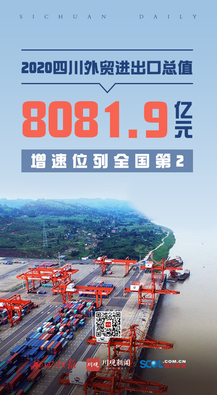 2020年四川外贸进、出口同步快速增长外贸规模再创历史新高!1月20日,记者从成都海关举行的2021年第一次新闻发布会上获悉,2020年四川货物贸易进出口总值8081.9亿元,规模位列全国第八,较2019年同比增长19%,增速位列全国第二。
