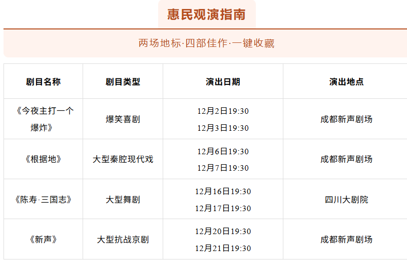 展演内容涵盖喜剧、京剧、舞剧、秦腔等艺术形式,共有4部作品,在成都新声剧场、四川大剧院演出8场,每个剧目演出两场,以零门槛申领方式让市民走进舞台艺术,活动持续至12月21日。
