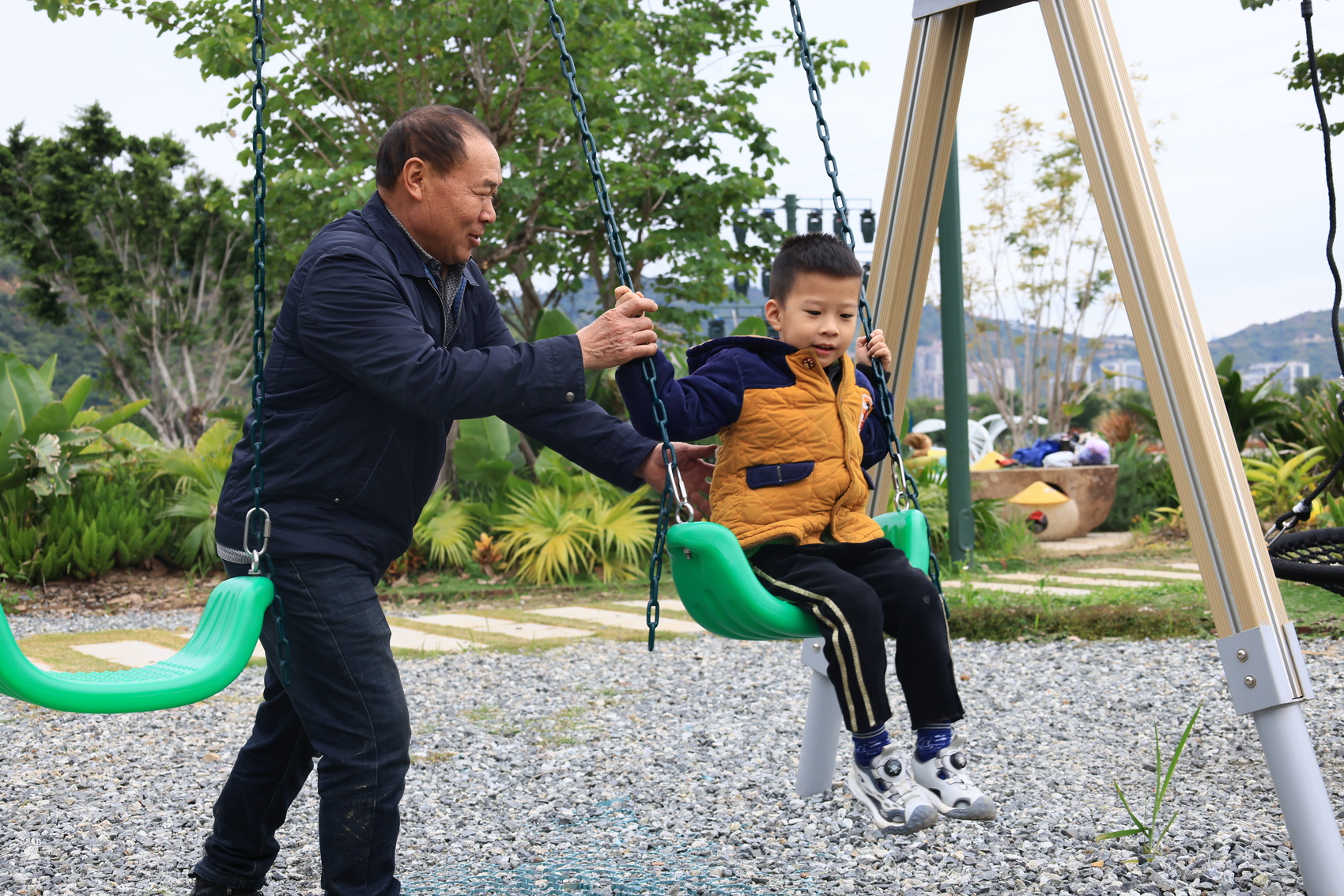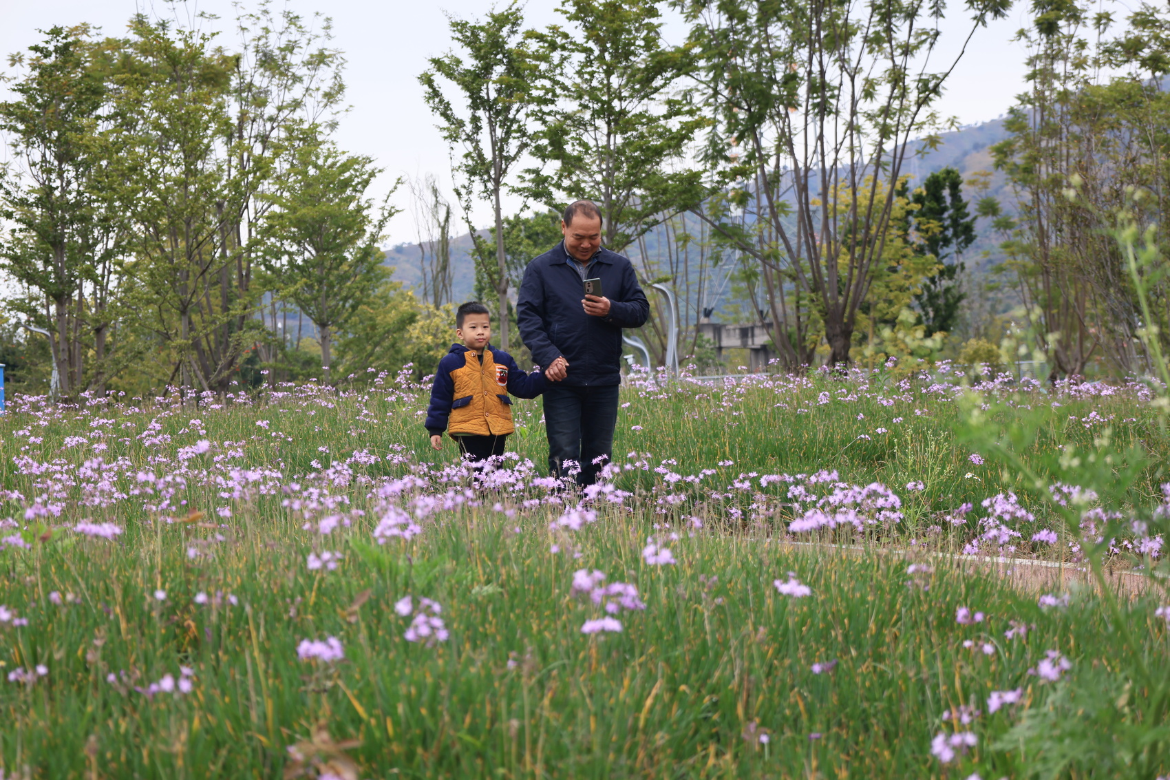 王美成和孙子在花海游玩(陈愉 摄)