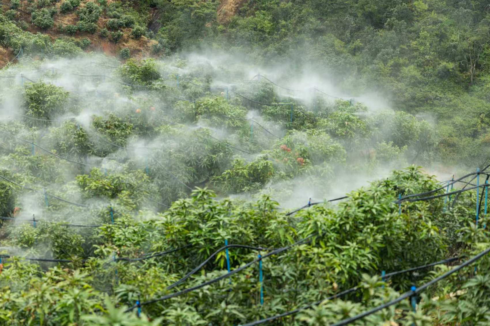 在山巅之上的金河村芒果种植园内,“智慧云空间弥雾系统”正在指挥田间的弥雾装置为果园喷灌,所用之水正是来自三滩村污水治理站点的净化水。弥雾系统通过科学配比肥料,并以雾化方式进行水肥喷施,使肥料随水分直接、均匀进入土壤。这不仅显著提升节水效果,也有效降低了对流域周边地下水的环境影响。