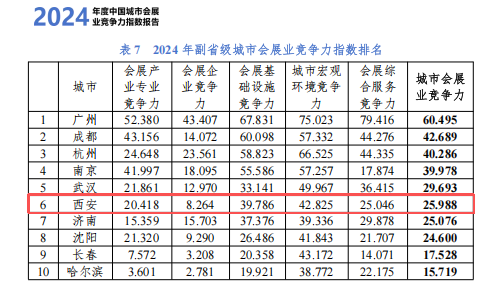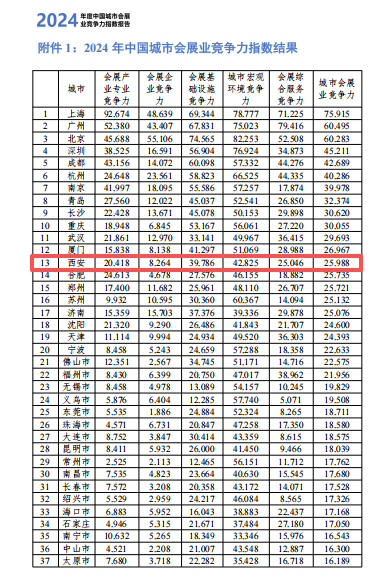 通过对全国216个会展城市的产业专业、市场主体、会展基础设施、城市宏观环境、会展综合服务5个竞争力维度和15项二级指标、44个三级指标综合体系评价,西安会展业竞争力居全国第13位(比上年度上升2位)、副省级城市第6位,连续两年被评为“中国最具竞争力会展城市”。