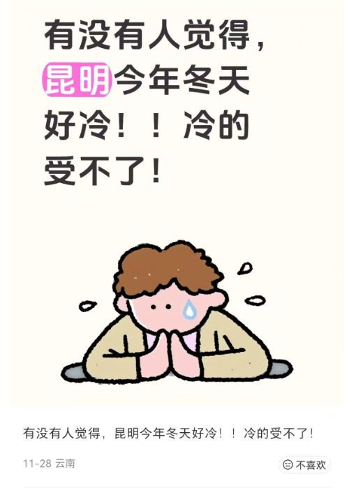 昆明今年的冬天为什么这么冷?社交平台上,不少网友发帖感叹:这几天即便是出着太阳,还是感觉冷……